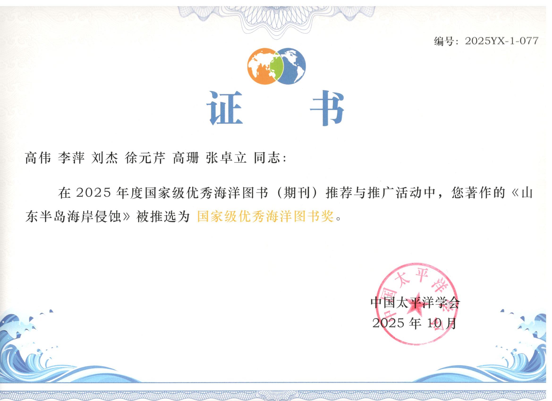 近日,在中國太平洋學(xué)會(huì)開展的2025年度國家級(jí)優(yōu)秀海洋圖書(期刊)評(píng)選推薦活動(dòng)中,由我所近海地質(zhì)環(huán)境及災(zāi)害研究團(tuán)隊(duì)編著的《山東半島海岸侵蝕》被評(píng)為2025年度國家級(jí)優(yōu)秀海洋圖書獎(jiǎng)。