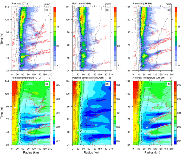 圖(a)-(c)表示不同數(shù)值實驗中降雨隨時間的演化,圖(d)-(f)表示不同實驗中112米高度位溫隨時間的演化。紅色實線表示正的位溫徑向梯度分布,黑色細實線表示10米風(fēng)速分布,黑色粗實線表示10米最大風(fēng)速半徑。CTL是對照實驗,NOSH實驗在臺風(fēng)外圍移除感熱通量,LH-SH實驗在臺風(fēng)外圍減小潛熱通量,減小量等于感熱通量。