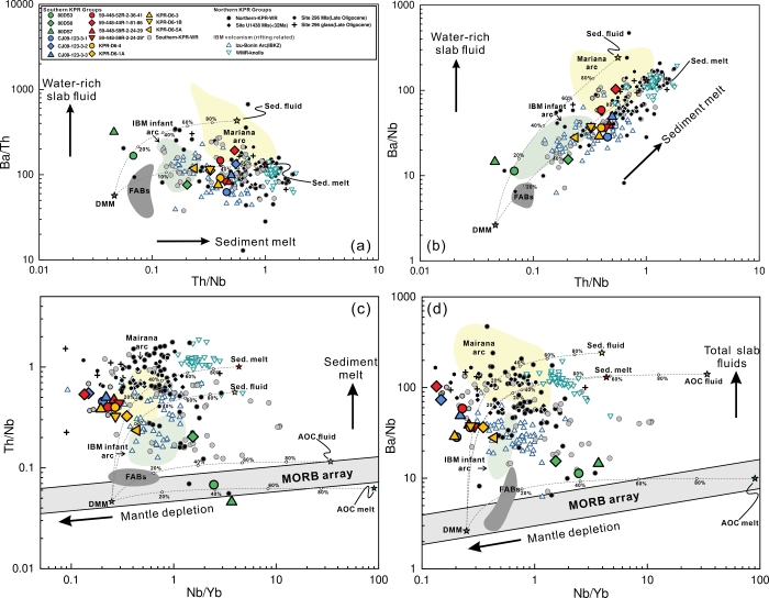 圖1 九州-帕勞脊熔巖與IBM典型弧巖漿的俯沖組分輸入特征