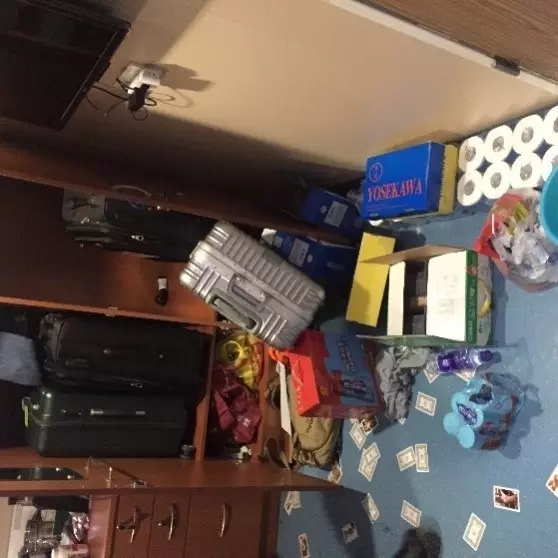 船上是住艙越高,晃起來(lái)越猛烈。住在三樓的同事們那是體會(huì)相當(dāng)深刻,他們房間的物品都來(lái)了個(gè)乾坤大挪移(圖1)??上攵麄冞@一夜是如何度過的了。據(jù)滕博士說他發(fā)明了一種新式的睡覺方法,效果良好,即四肢岔開,各找一個(gè)支撐點(diǎn)以固定身體。三樓的這些男同胞們凌晨四點(diǎn)還要冒雨起來(lái)布放潛標(biāo),必須強(qiáng)迫自己睡著以養(yǎng)足精神,這一夜真是夠煎熬的。