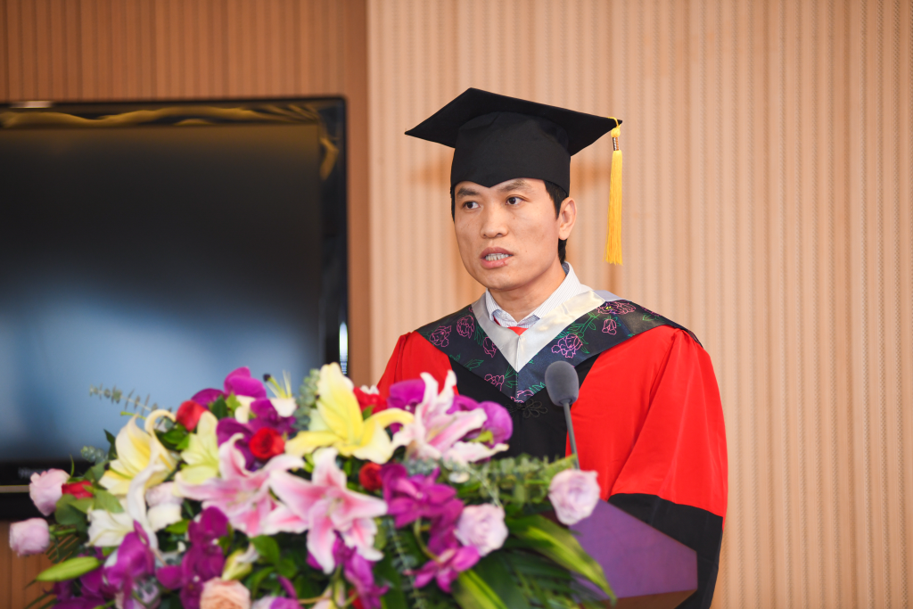 儀式上,畢業(yè)生代表黃龍宇分享了三年來在所期間的成長(zhǎng)與蛻變,感謝母校給予他的勇氣與堅(jiān)持,感謝母校給予他“家”一般的溫暖與支持,表示未來將繼續(xù)勇于挑戰(zhàn)、突破自我、發(fā)光發(fā)熱。