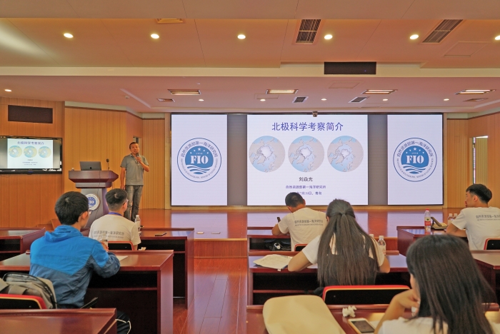 我所海洋地質(zhì)與地球物理實(shí)驗(yàn)室副主任劉焱光研究員從北冰洋的過(guò)去、現(xiàn)在和未來(lái)三個(gè)角度介紹了我所近年來(lái)在北極海域進(jìn)行的科學(xué)考察,為同學(xué)們展示了全球河流的輸沙量圖、全球氣溫分布圖、全球太陽(yáng)輻射分布圖、北極圈永久凍土和可燃冰圖,強(qiáng)調(diào)了開(kāi)展極地科學(xué)研究對(duì)于探索全球氣候變化有著重要意義。