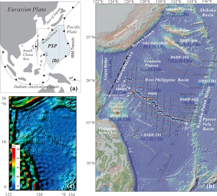 菲律賓海板塊是西太平洋匯聚發(fā)育的巨型溝-弧-盆系統(tǒng)的重要組成部分。相關(guān)研究顯示,該板塊在向北遷移過(guò)程中自西向東依次形成了一系列的弧后盆地以及殘余弧和活動(dòng)弧。始新世期間形成的西菲律賓海盆是菲律賓板塊的組成部分,然而對(duì)該海盆的形成演化過(guò)程的理解存在較大爭(zhēng)議。
