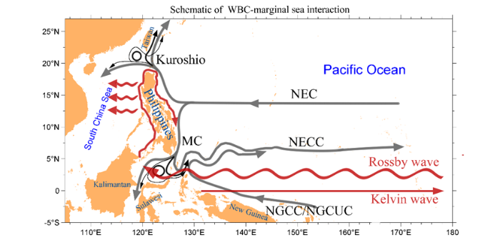 研究發(fā)現(xiàn),2010-2011年拉尼娜冬季,棉蘭老流的流量增加了約5-10Sv。衛(wèi)星數(shù)據(jù)和模式實(shí)驗(yàn)結(jié)果表明,這種年際變化受環(huán)繞菲律賓的開爾文波的傳播控制。拉尼娜期間,下降的赤道羅斯貝波在棉蘭老島以南海域激發(fā)沿岸開爾文波,從蘇拉威西-蘇祿海進(jìn)入南海,并沿菲律賓群島順時(shí)針傳播回到西太平洋,引起菲律賓東岸的海平面上升,海平面向東傾斜增加,地轉(zhuǎn)效應(yīng)導(dǎo)致西邊界流出現(xiàn)南向流量異常。厄爾尼諾年的情況則與之相反。以上結(jié)論,與過(guò)去的模式結(jié)果相反,顛覆了傳統(tǒng)的認(rèn)識(shí)。
