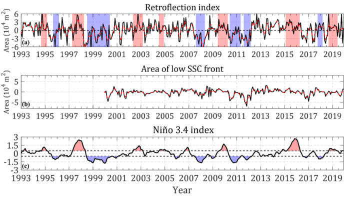 圖2. 棉蘭老流回轉(zhuǎn)指數(shù)(a)與海表葉綠素低值區(qū)面積(b)以及尼諾3.4指數(shù)(c)的比較。回轉(zhuǎn)指數(shù)定義為6.5oN緯線、129oE經(jīng)線與棉蘭老流主軸包圍的面積,海表葉綠素低值區(qū)定義為以上經(jīng)緯線與0.1 葉綠素濃度等值線包圍的面積。