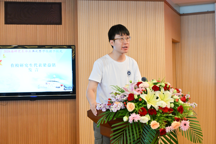 在校生代表梁益銘在發(fā)言中回憶了與師兄師姐們共同學(xué)習(xí)成長(zhǎng)的時(shí)光,感謝師兄師姐們給予的關(guān)心和幫助,感謝海洋一所各位老師們的悉心指導(dǎo)和栽培,祝愿畢業(yè)生們?cè)谛碌恼鞒讨欣^續(xù)發(fā)揚(yáng)“拓海探極、聚力創(chuàng)新”的科研使命與擔(dān)當(dāng),實(shí)現(xiàn)自己的人生價(jià)值。