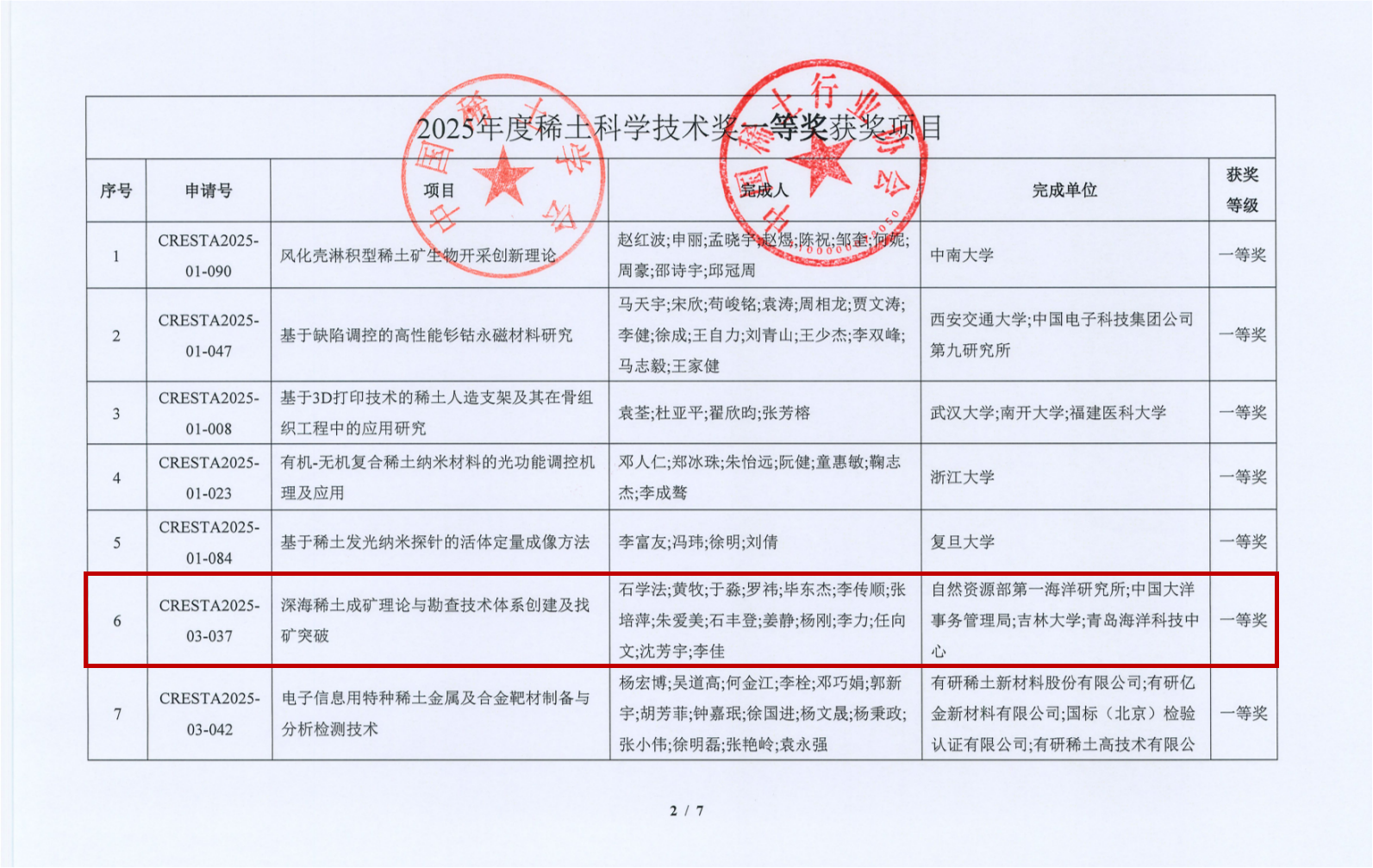 喜報(bào):我所深海稀土研究成果榮獲2025年度稀土科學(xué)技術(shù)獎(jiǎng)一等獎(jiǎng)