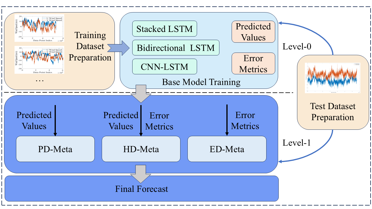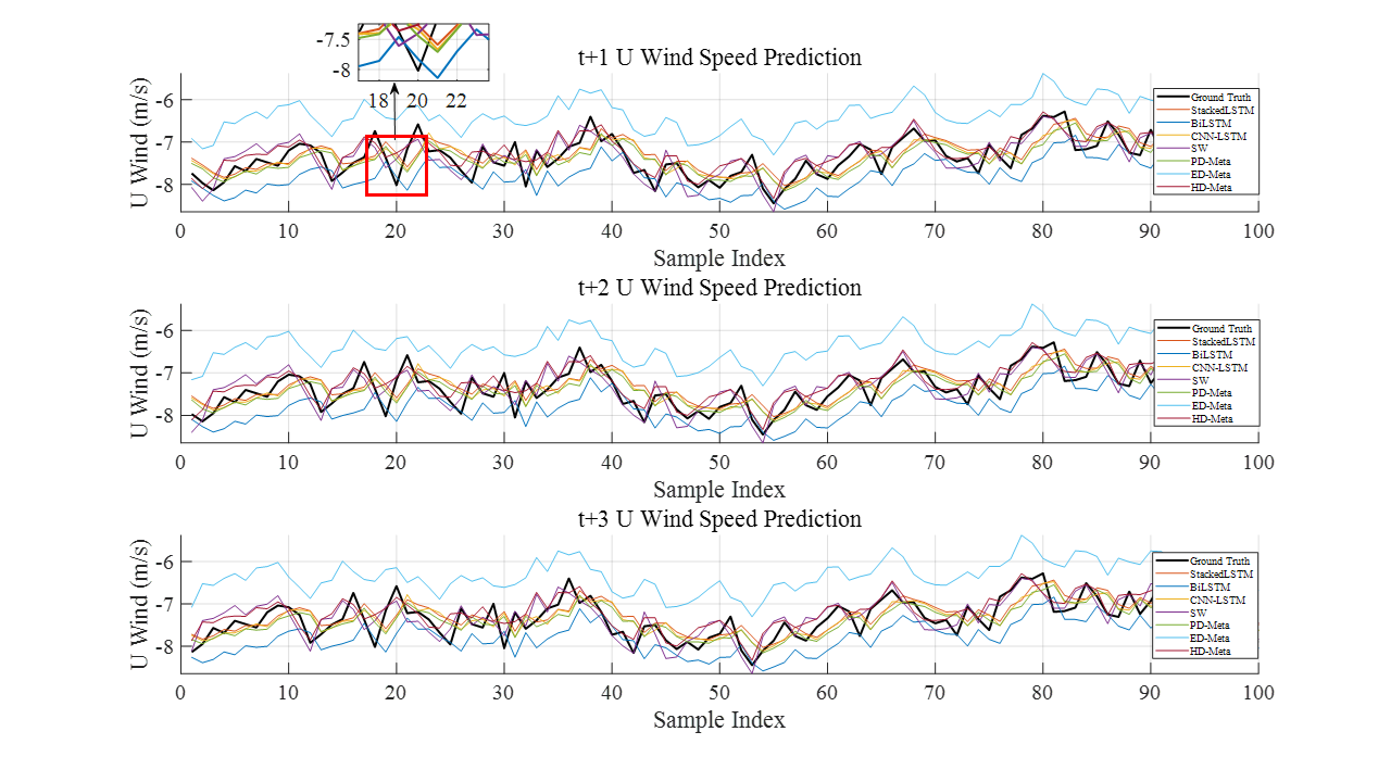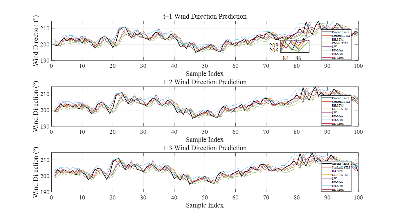 針對(duì)這一問題,研究人員提出了一種創(chuàng)新性的混合驅(qū)動(dòng)元學(xué)習(xí)(HD-Meta)預(yù)測(cè)框架。該方法通過多模型融合與元學(xué)習(xí)機(jī)制,將不同學(xué)習(xí)器的預(yù)測(cè)結(jié)果和誤差信息進(jìn)行聯(lián)合建模,從而在提升預(yù)測(cè)精度的同時(shí)兼顧計(jì)算效率。實(shí)驗(yàn)結(jié)果表明,HD-Meta 在短時(shí)風(fēng)速和風(fēng)向預(yù)測(cè)任務(wù)中均優(yōu)于傳統(tǒng)方法,尤其在捕捉微小風(fēng)向變化方面表現(xiàn)突出,為無人帆船在復(fù)雜海洋環(huán)境中的自主航行提供了更加可靠的風(fēng)場(chǎng)感知支持。