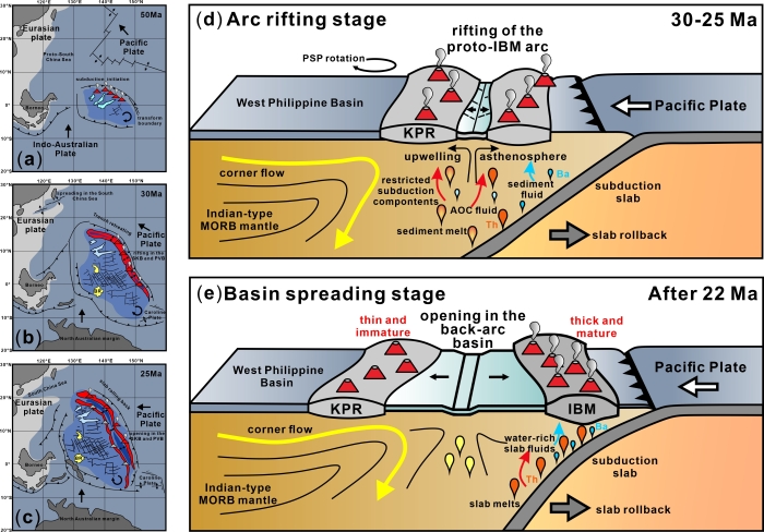 針對上述問題,研究團隊綜合利用國際大洋鉆探計劃、中-德聯(lián)合航次、海洋一所和海洋二所執(zhí)行的西太平洋專項等地質地球物理調查航次中所獲取的九州-帕勞脊南段基底巖石樣品,系統(tǒng)開展了年代學、巖石學和地球化學分析研究,獲得了以下關鍵認識:九州-帕勞脊南段熔巖的地幔源區(qū)具有顯著的不均一性,暗示了九州-帕勞脊弧下地幔經(jīng)歷了復雜的地質過程;與九州-帕勞脊北段相比,九州-帕勞脊南段熔巖中來自俯沖板片輸入物質的貢獻信號顯著減弱(圖1),顯示出與嬰兒期IBM弧巖漿相似的地球化學特征。并且,本研究創(chuàng)新性地提出了九州-帕勞脊演化的概念模型(圖2),指出菲律賓海板塊自身運動學特征(如板塊旋轉)與區(qū)域伸展應力共同控制了古IBM弧的裂解過程,伸展背景下弧下軟流圈物質的被動上涌可能阻礙了俯沖組分對九州-帕勞脊弧下地幔的持續(xù)改造,進而中斷了九州-帕勞脊向成熟島弧的演化進程。該研究以巖石地球化學視角,系統(tǒng)揭示了九州-帕勞脊南、北段在島弧初始裂谷向弧后擴張的過渡階段所表現(xiàn)出的差異性巖漿作用,并為“九州-帕勞脊是不成熟的洋內弧” 的基底屬性提供了堅實的、直接地球化學證據(jù)。