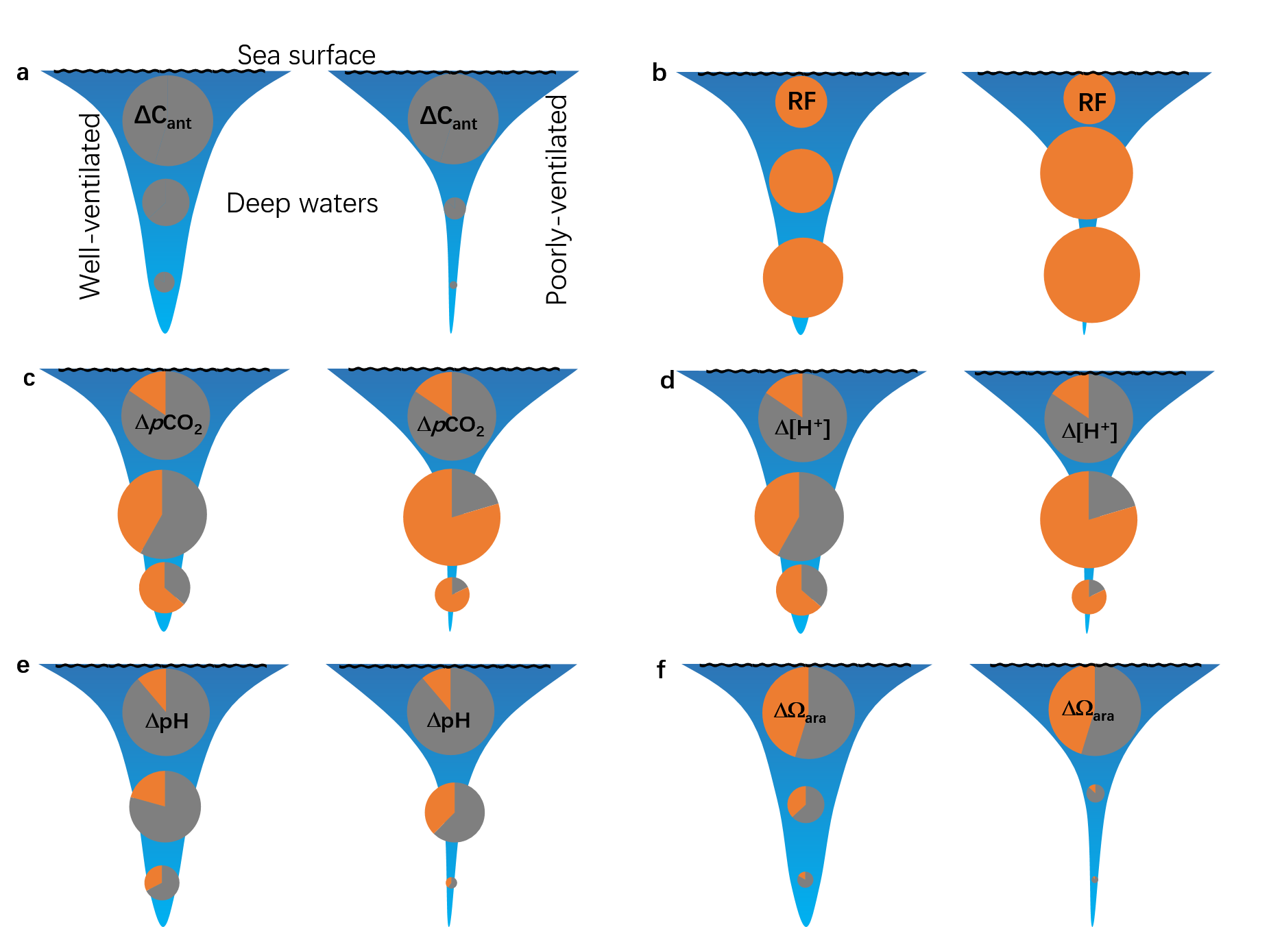 圖1不同通風(fēng)條件下水柱中人為CO2累積(ΔCant)及酸化指標(biāo)變化示意圖。圖(a)至(f)分別表示ΔCant(a)、碳酸鹽緩沖因子指數(shù)RF(b)、二氧化碳分壓變化ΔpCO2(c)、氫離子濃度變化Δ[H?](d)、pH變化ΔpH(e)以及碳酸鈣飽和度變化ΔΩara(f)的垂向分布。圖中藍(lán)色背景反映垂向通風(fēng)的相對強(qiáng)弱;餅圖的大小對應(yīng)ΔCant、RF及各酸化指標(biāo)的變化幅度。其中灰色部分表示在與表層海水相同緩沖能力下,由ΔCant直接引起的酸化指標(biāo)變化,橙色部分則表示緩沖能力差異所引起的變化。