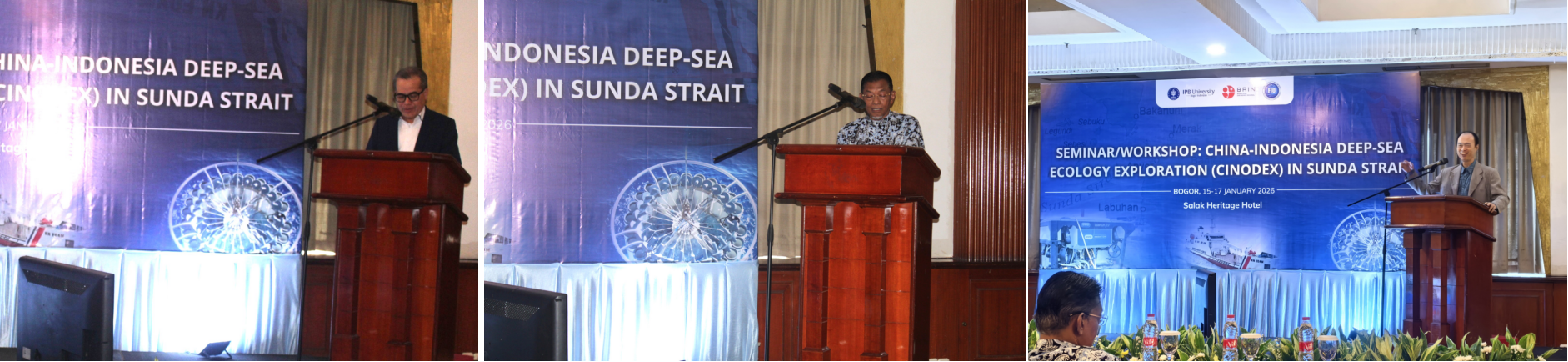 茂物大學副校長 Iskandar Siregar 教授、漁業(yè)與海洋科學學院院長Fredinan Yulianda教授和我所張學雷致究員分別致辭