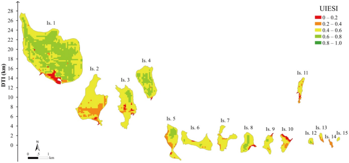 圖2 廟島群島無(wú)居民海島生態(tài)敏感度指數(shù)(UIESI)空間格局