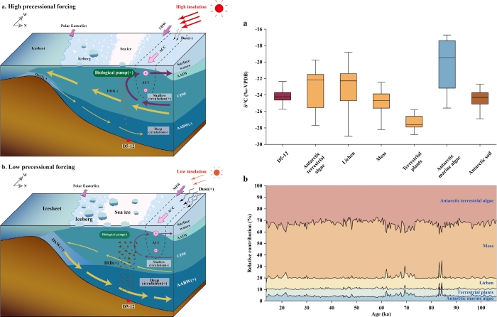 左圖 不同歲差強迫下局地太陽輻射調(diào)控海洋生產(chǎn)力與冰蓋演化機制示意圖