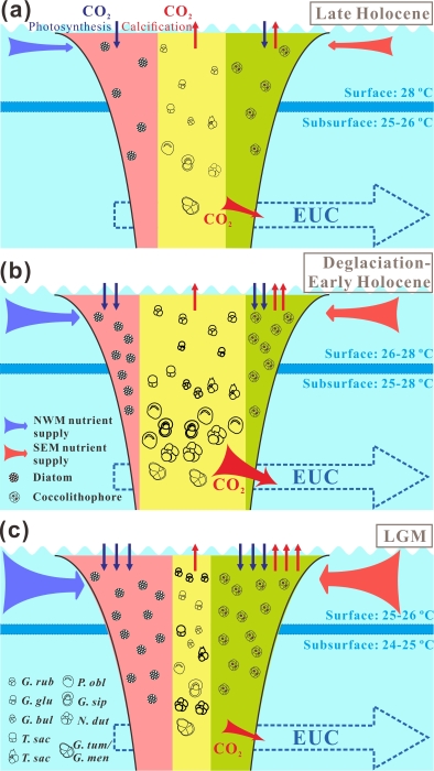 圖2 熱帶西太平洋末次冰盛期-全新世生物泵演化的概念模式圖