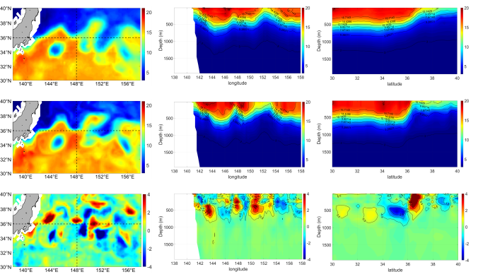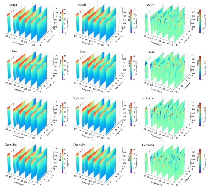 研究結(jié)果表明,提出的海洋次表層溫度場重構(gòu)模型能獲得海洋內(nèi)部溫度的空間分布、垂向結(jié)構(gòu)及季節(jié)變化特征,特別是在溫躍層和深層表現(xiàn)出更好的穩(wěn)定性,再現(xiàn)了中尺度渦旋與鋒面的熱結(jié)構(gòu)特征。相關(guān)成果為利用衛(wèi)星遙感反演海洋內(nèi)部熱結(jié)構(gòu)提供了新方法,也可為海洋動力過程分析、氣候變化研究和海洋環(huán)境業(yè)務(wù)化監(jiān)測提供技術(shù)支撐。